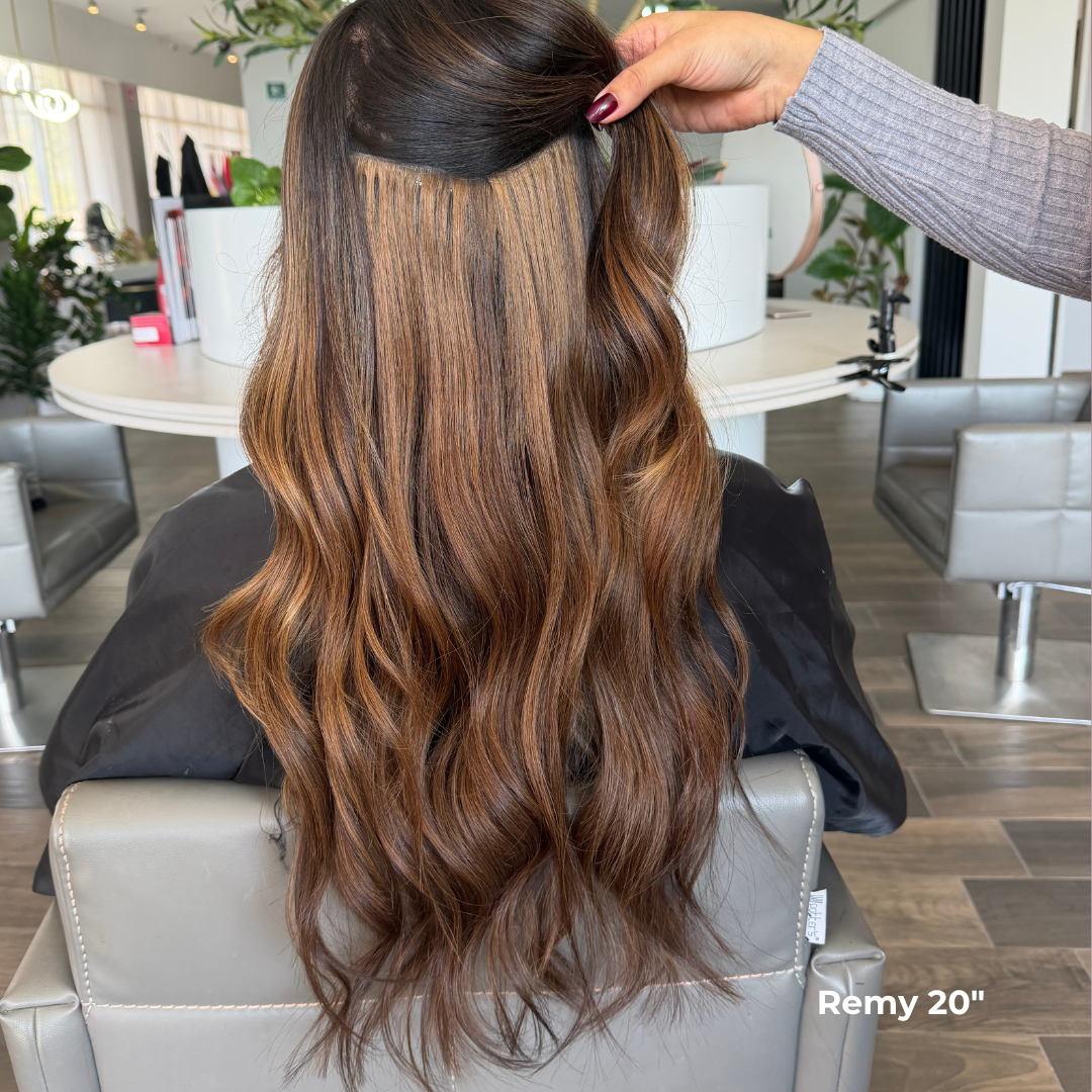 Nuestro método más reciente y ÚNICO en el mercado a nivel mundial. Consta de una cortina de clip que abarca el diámetro de tu cabeza y tiene 6 clips; su aplicación es sumamente fácil, además de que garantiza comodidad al máximo y súper fácil aplicación. Puedes aplicarlas y retirarlas en el momento que lo desees.